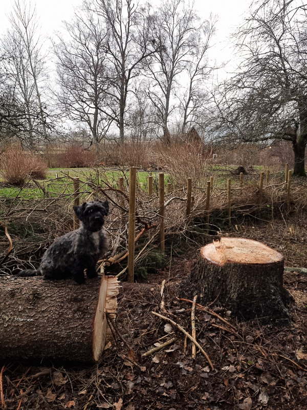 – Fått upp de sista bitarna kastanjestaket runt köksträdgården. Det blir en fin inramning och nu under vintern håller det ankorna inne och Evi ute (: