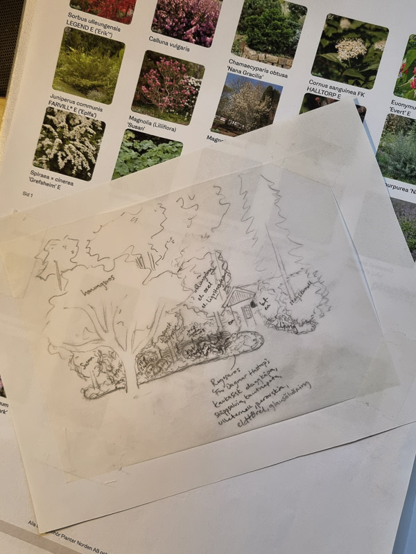 – Skissat och gjort en plan för hela ytan framför jordkällaren, det blir en stor plantering med blommande buskar, gröna klot, marktäckare och antagligen en ullungrönn (som jag länge längtat efter att få plantera i min egen trädgård för de fantastiska höstfärgerna). Det blir fint att rama in jordkällaren som tidigare alltid varit dold av granen.