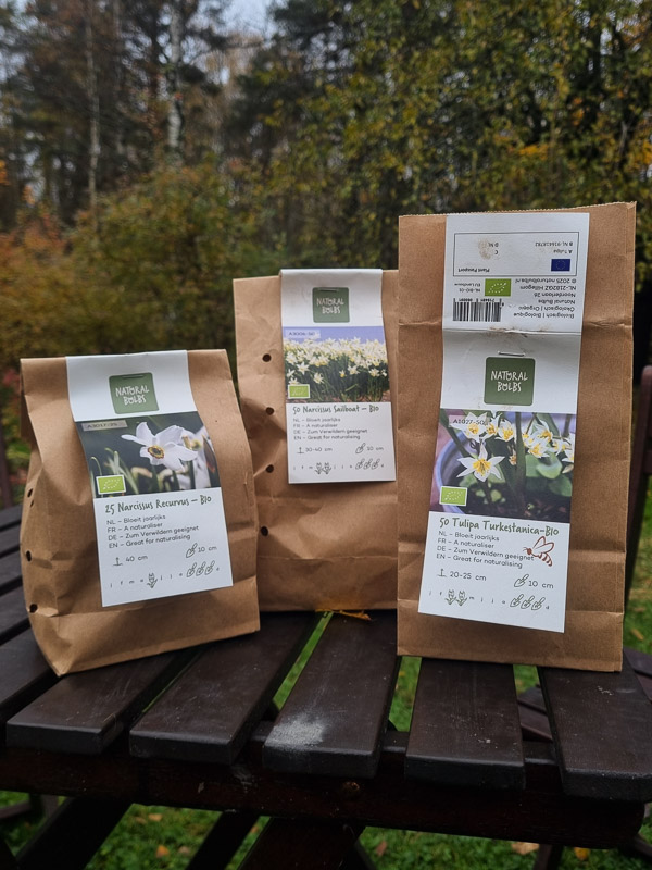 – Botaniska tulpaner (Tulipa saxatilis och Tulipa turkestanica) och narcisser (’Sailboat’ och ’Recurvus’) i de nya perennrabatterna
