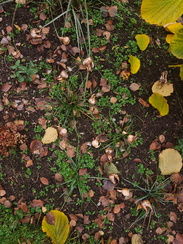 Jag kastar ut lökarna i rabatten och gräver sen ner dem som de landar – lite huller om buller.