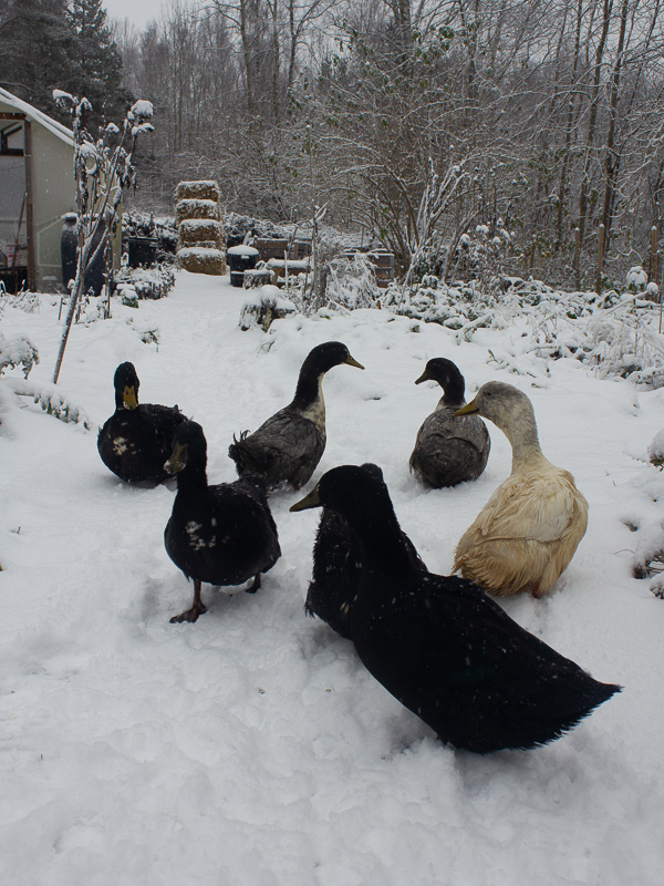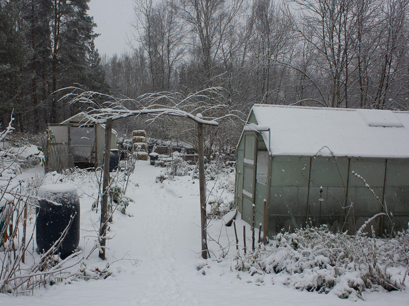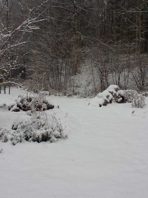 Kylan och snön har begränsat vad jag har kunnat göra i trädgården den här veckan, så det här inlägget blir en tunn trädgårdsdagbok – men jag bjuder på lite snöbilder istället.